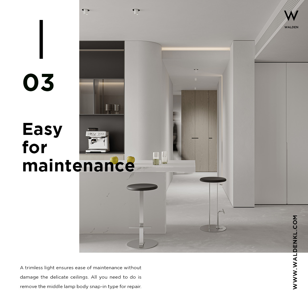 A trimless light ensures ease of maintenance without damaging the delicate ceilings. All you need to do is remove the middle lamp body snap-in type for repair.