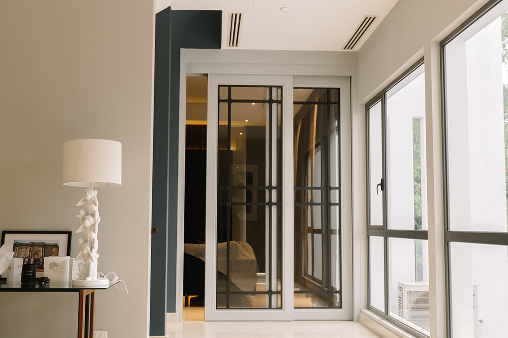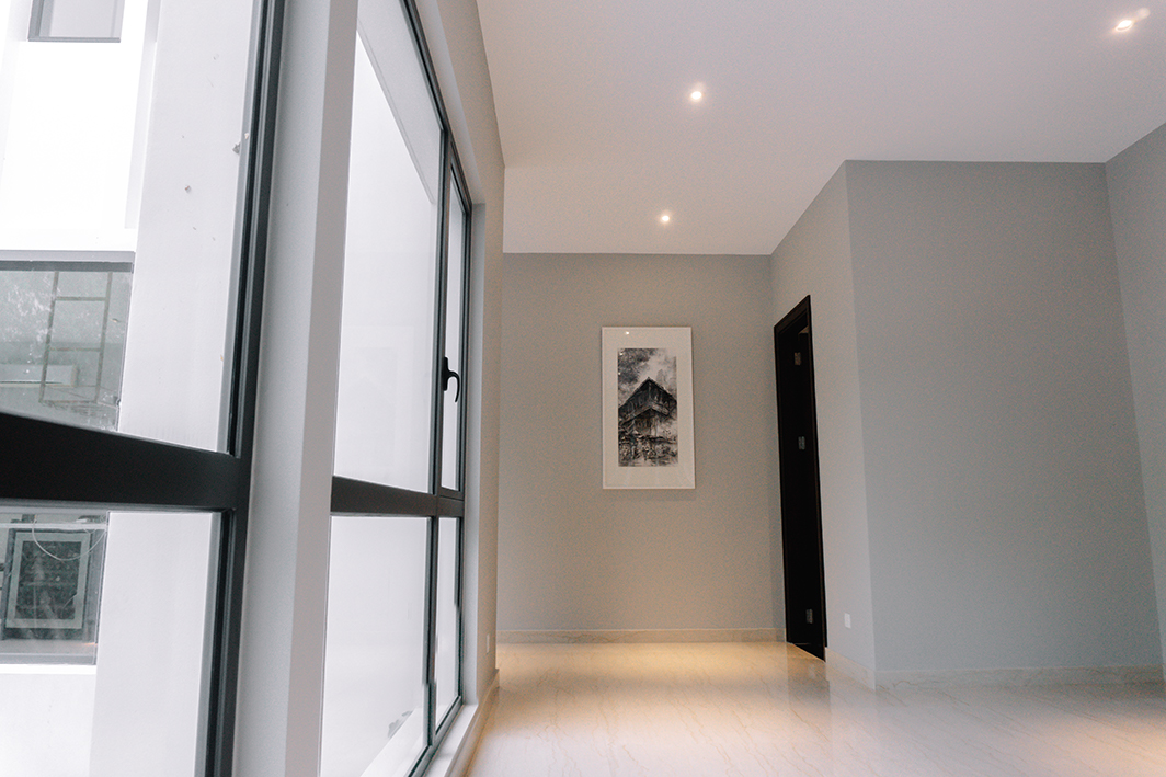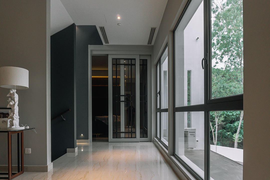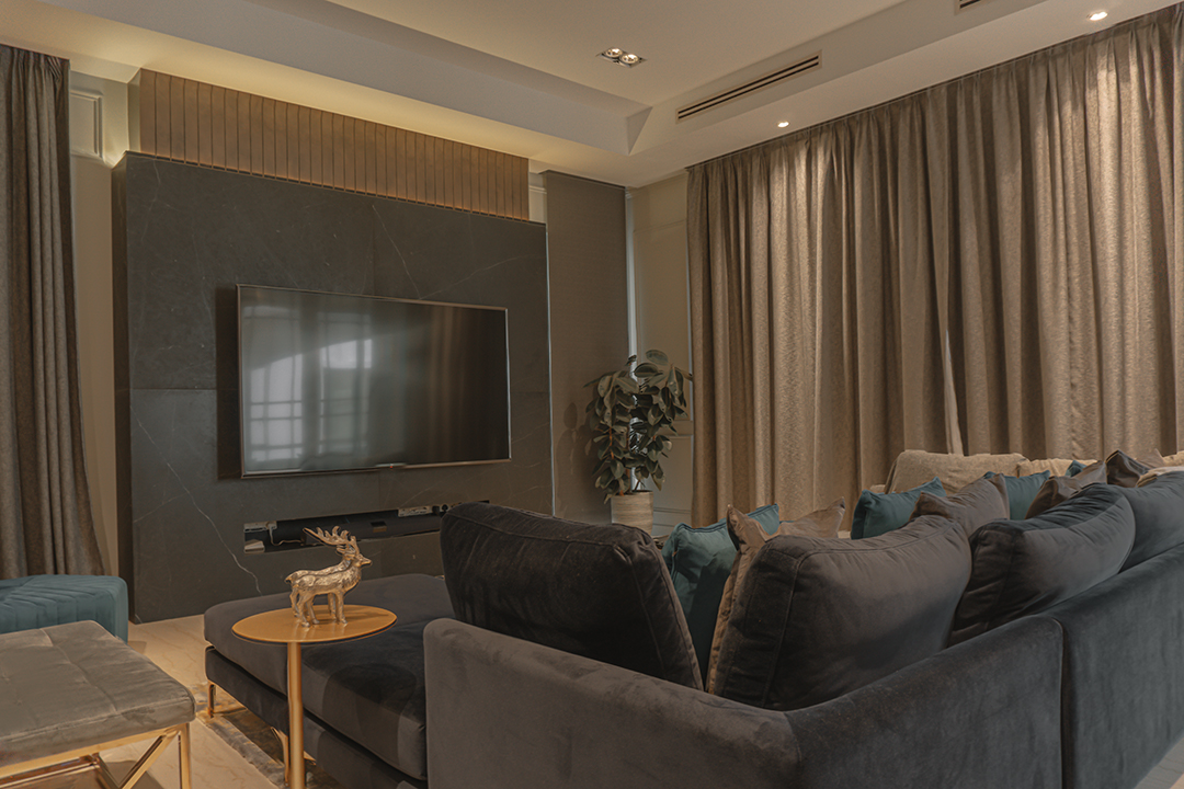 Richard and his family are passionate about modern and contemporary design, and have incorporated a mixture of materials, such as marble, fabric, wooden flooring, and glass, to create a unique combination of textures in their space. The kitchen is designed with a modern aesthetic, featuring dark wood and black materials that are accentuated with warm white LED strips. Being an appreciator of modern art, the owner requested that we highlight not only his paintings, but also the textures throughout the house. Our design balances both functional and cozy ambiances, with the flexibility to switch between different moods.