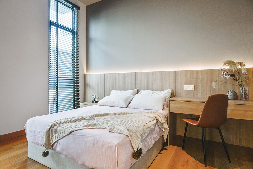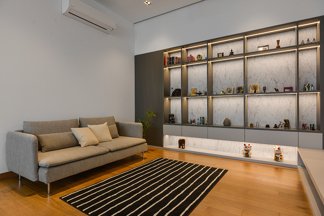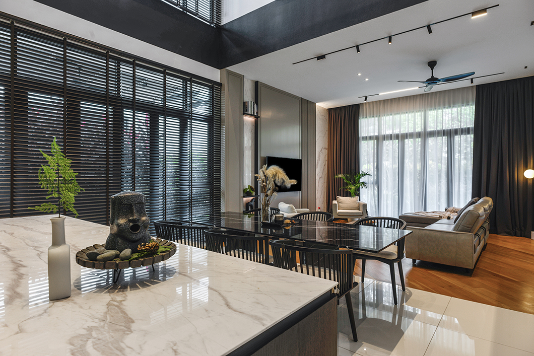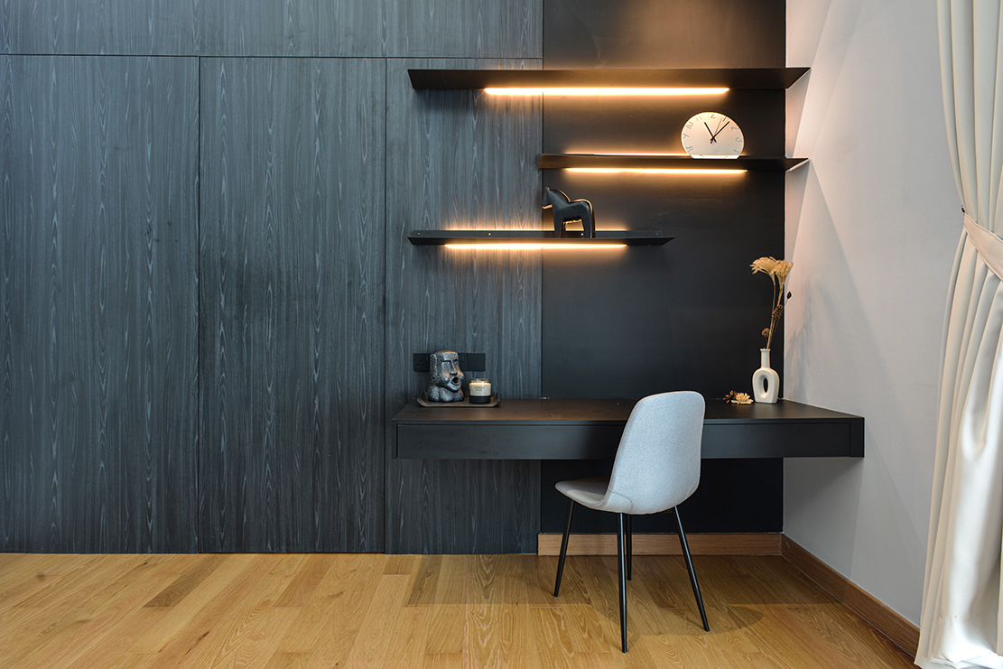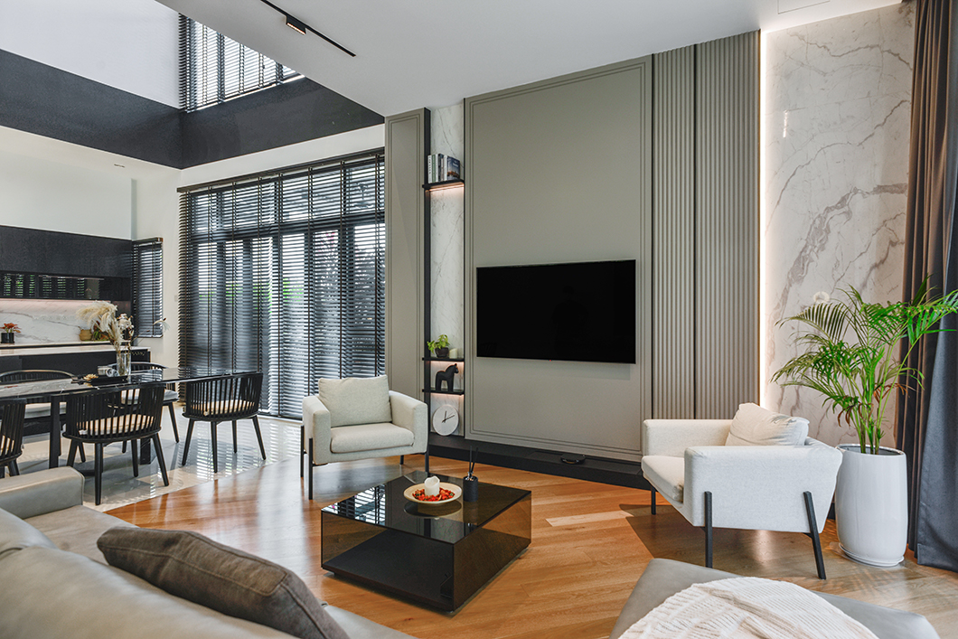 Jin\'s home exudes a perfect balance between modern and classic design elements. The living room boasts a sleek grey wall with a wood texture frame, a nod to the classic style. The ceiling design incorporates classic touches, and the marble flooring adds a touch of elegance. The dining room exudes a cozy ambiance, with a neutral color scheme and wood texture design on the panels. The lighting is reminiscent of a high-end restaurant, with a great atmosphere that complements the space. The master bedroom is modern, with a striking contrast of various materials. Lighting in the master bedroom is fully dimmable, with bedside controls allowing the client to customize the atmosphere to their liking. Overall, the house is a wonderful example of a cozy, intimate space that can easily be transformed with lighting to set the mood for any occasion.